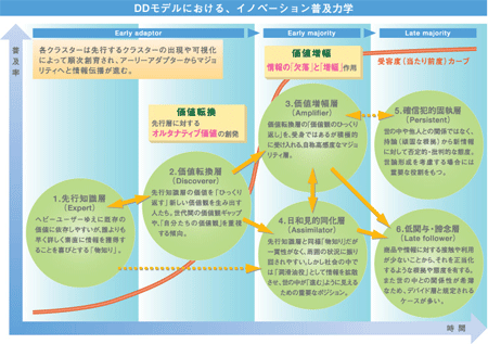 再解釈・再定義され、結果的には予想を超えた大ヒットが生まれたりします。この研究では、そのような現象のことを需要側イノベーション現象と呼び、その現象を包括的にとらえるための仮説の構築と・コンピュータを用いたシミュレーションを行っています。それらを通じて、価値転換現象仮説(後発技術が先発技術を追い抜いて市場での主流な技術価値が転換する現象を説明する仮説)、価値増幅現象仮説(技術が持つ特定の価値だけが市場内で増幅される現象を説明する仮説)、などの発生メカニズムを検証します。