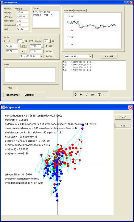 模擬市場実験で利用している取引システムのユーザ画面(上)